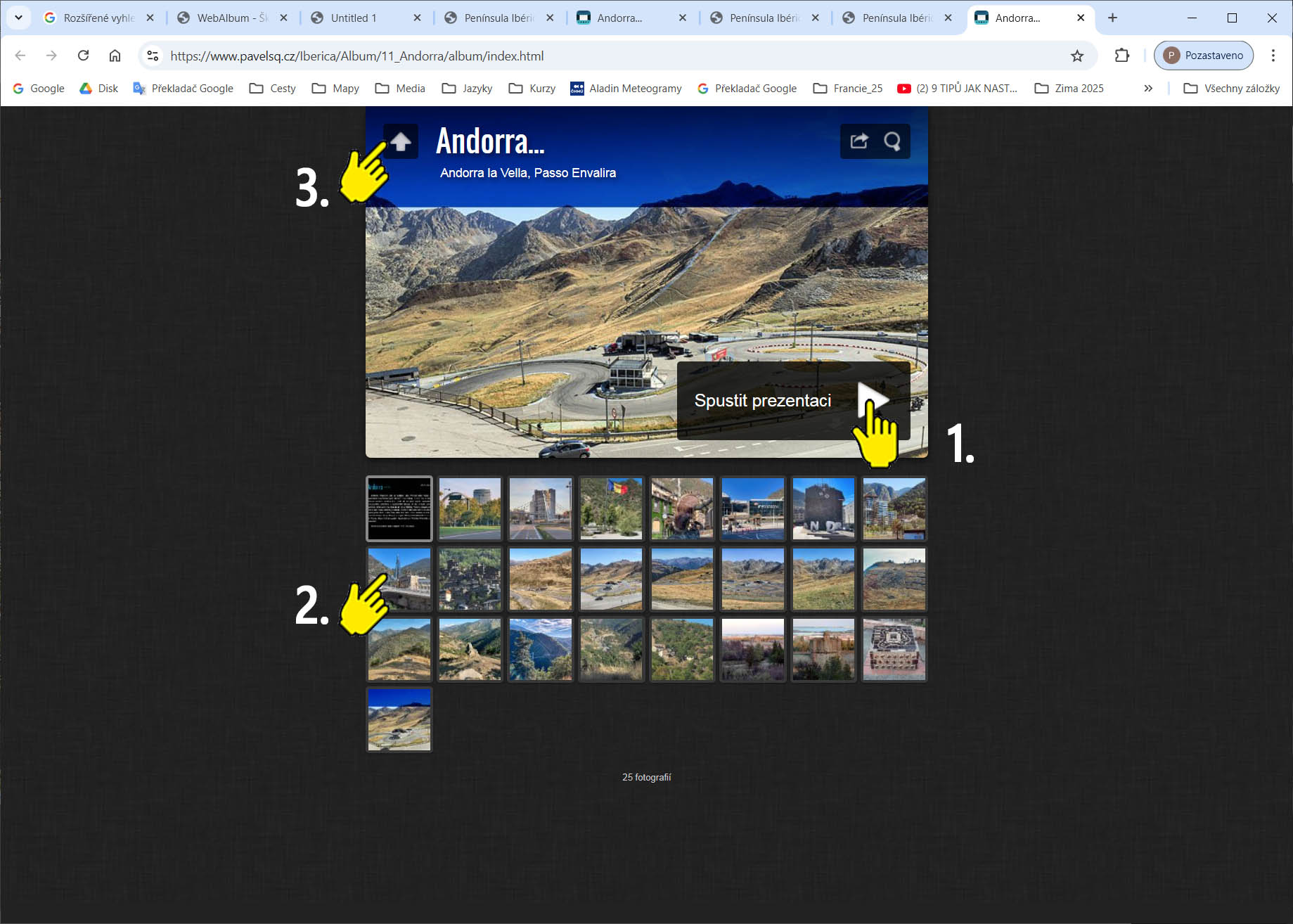 Prohlížet lze bez automatické prezentace najetím kurzorem na zvolené fotografie, následně lze listovt myší, šipkami, nebo klávesami Home, End.