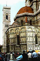zvonice je však původní (14. stol.) Před katedrálou je osmiboká křestní kaple - Baptisterium San Giovanni založená na na přelomu IV. a V. století. Dnešní podoba pochází až na detaily ze 13. století. Proslulými prvky vnější výzdoby jsou bronzové dveře - jižní (Andrea Pisano), severní a východní (Lorenzo Ghiberti). Uvnitř je impozantní mozaiková výzdoba a vzácné sochy. Ty však znám jen z literatury - dovnitř jsme se nedostali. |