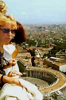 Odtud se vejde Vatikán s objektivem 50 mm na pět snímků. Cesta nahoru nebyla bez problémů: při vstupu do baziliky byla Zdena vykázána pro krátkou sukni. Poté, co papežsky bodyguard vpustil jinou návštěvnici v kraťasech, musel přijmout naši reklamaci a nakonec nás vpustil (tedy Zdenu, my s Danem jsme problémy neměli). Pokračuje se výtahem na střechu baziliky a dále po schodech - nejprve na vnitřní ochoz kopule. Je tam nádherný pohled do chrámu, přímo nad prosluly bronzový baldachýn od Berniniho a na mozaikovou výzdobu kopule, která není zdola pořádně vidět. Dále se pokračuje úzkým schodištěm až na vyhlídkovou laternu. V určitém úseku kopíruje chodba boční profil kopule a proto jsou tam šikmé stěny a musíte jit nakřivo. Z laterny je vidět značná část Říma a určitě celý Vatikán. Krásné jsou jeho zahrady, které opět prznil všudypřítomný jeřáb. Cela fasáda basiliky byla zahalena v pytlovině zakrývající lešení. Před touto prohlídkou jsem zakládal novy film (100 ASA) a po exponování asi dvanácti panoramatických snímků z kopule jsem si všiml, že mám nastavenou citlivost na aparátu na 400 ASA a že jsem krutě přeexponoval. Po vyvolání vyšly snímky kupodivu dobře. |