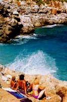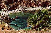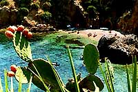 blížilo mým představám. Ne - ostatní krajina vypadala úplně jinak. Lo Zingaro je asi osm kilometrů skalnatého pobřeží a přilehlých hor, které dosahují více jak 900 m n. m., což s ohledem na malou vzdálenost od moře působí dosti impozantně. Do hor vedou dokonce značené turistické cesty (na místní podmínky je to výjimka - vždyť je to rezervace), které jsme pro omezené časové možnosti neměli možnost otestovat. V celé rezervaci není žádná silnice, jen cesta pro pěší a mezky. Je to místo,jehož návštěvu nelze vynechat. Organizátoři rekreace, vědomi si atraktivnosti této rezervace, zorganizovali dva fakultativní zájezdy, což účastníci dokázali ohodnotit. Zde si přijdou na své milovníci koupání, skalní turisté i milovníci flóry. Přestože je rezervace hojně navštěvována, nemáte dojem, že by zde bylo celkově přeplněno. |